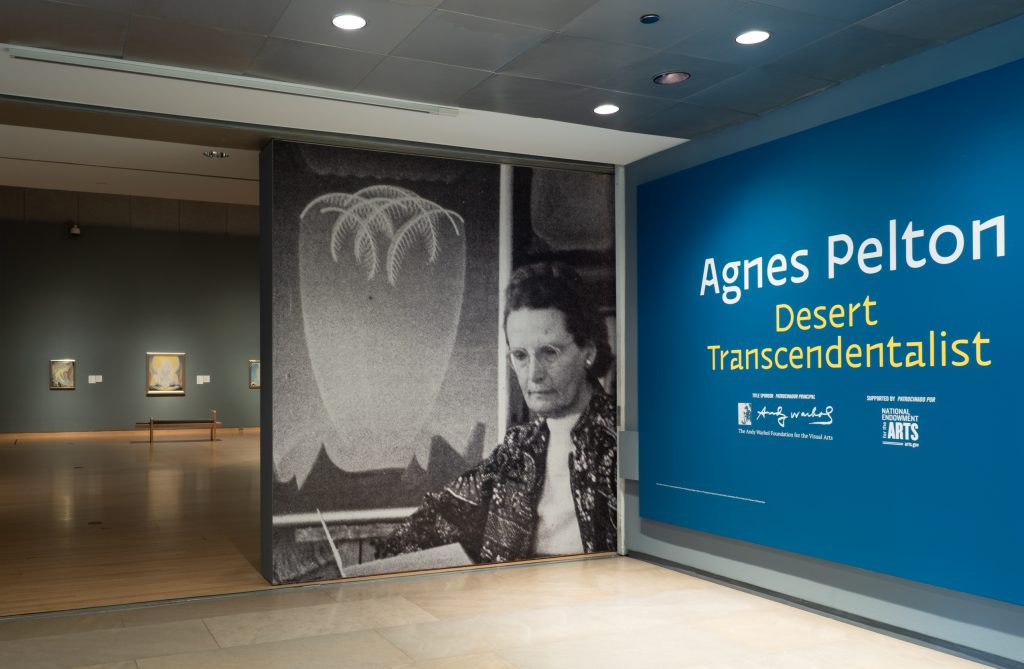 Intentionally moving away from the “mainstream” arts community, Pelton eventually settled in Cathedral City, California. She painted conventional desert landscapes to make a living, but it was her abstract studies of earth and light, biomorphic compositions of delicate veils, shimmering stars, and atmospheric horizon lines, that distinguished her work. A believer in numerology, astrology, and faith healing, Pelton’s abstract compositions propelled her into an esoteric world epitomized by the Transcendental Painting Group (1938-1942), a short-lived group that promoted abstract, non-objective art.
