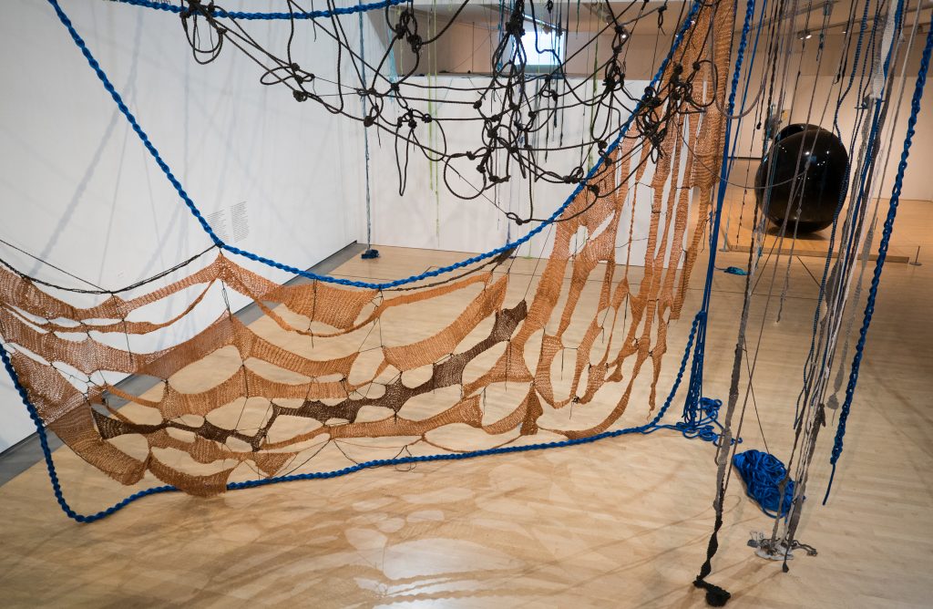 Sheila Pepe, Red Hook at Bedford Terrace (detail with artist), 2008. Shoelaces, cotton yarn, and nautical towline. Variable dimensions. Smith College Museum of Art, Purchased with gifts from members of the Museum’s Visiting Committee in honor of the retirement of Ann Johnson.
